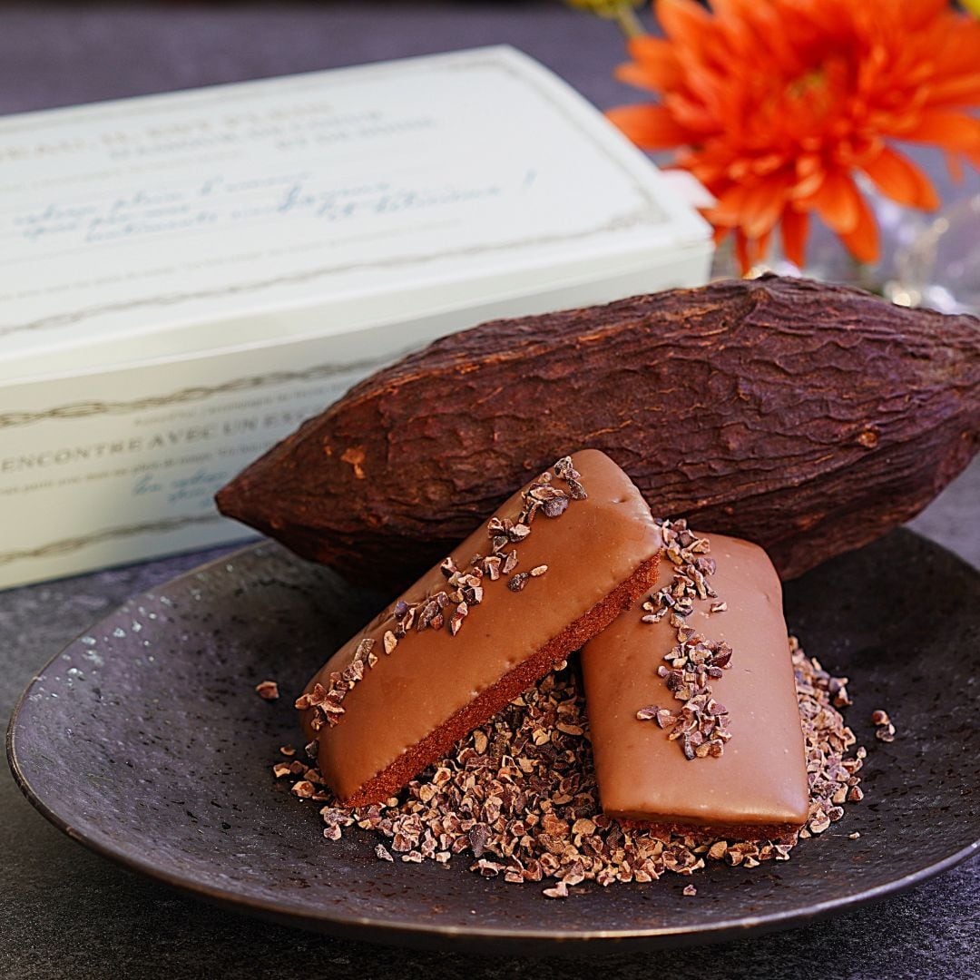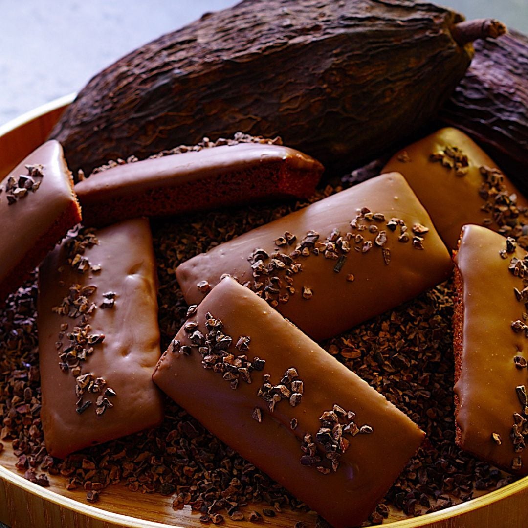 カカオパウダーを練り込んだしっとり生地の上部全面に、有機カカオ(カカオ61%)とホワイトチョコレートで仕立てたミルクチョコレートをたっぷりとコーティング。